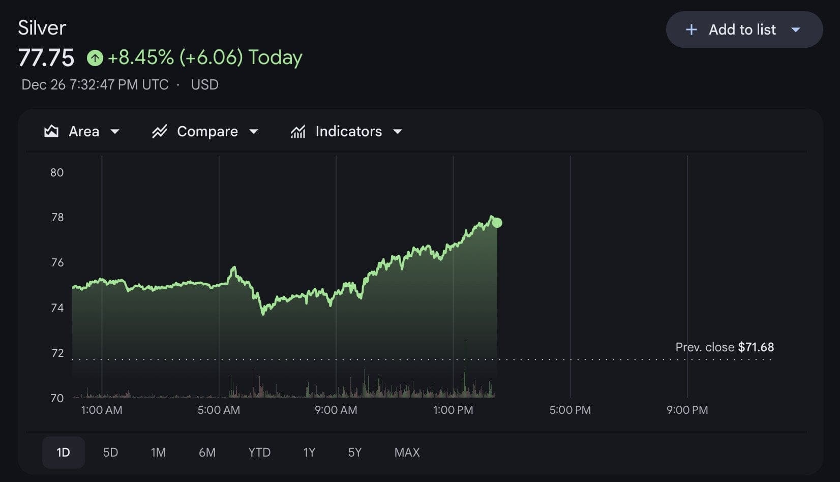 Silver has absolutely exploded higher over the Christmas holiday week, surging above $60, above $70 and now pushing towards $80 next as it currently trades at $77.75 as I write this article.