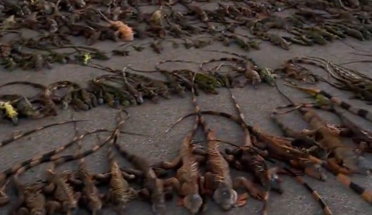 But that’s not the strangest thing falling from the skies: thousands of cold-stunned green iguanas have been dropping onto streets, pavements and front gardens.