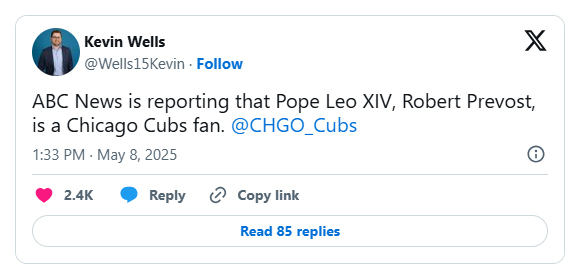 WELL, this is an interesting development. I board a ship in Miami, forsaking the Internet. Francis is dead, and by the time I arrive in Spain, nearly two weeks later, an American has become the new Pope of Rome. His name is Leo XIV, aka Robert Prevost, and he comes to us from the Windy City. Now I’m learning that the number one song in the world is Kanye West singing “Heil, Hitler!” What the hell happened, did I go missing in another reality while crossing the Bermuda Triangle, and have I entered a new dimension? JD, aka the Grim Reaper, sits down with Pope Francis on the eve of his death, and then the black smoke rises from the Conclave for a Chicago Bears fan. Is it a regime shift, and how much of a pope’s job title is just waving? What a strange world we live in.