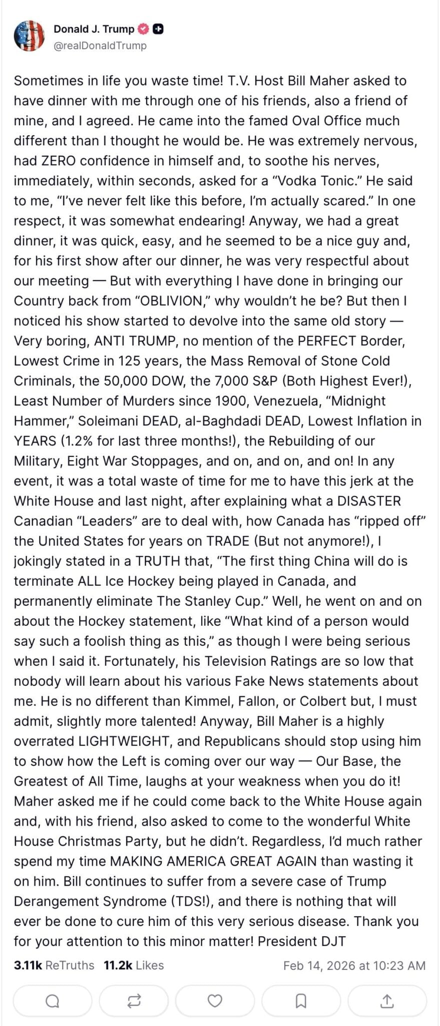 Sometimes in life you waste time! T.V. Host Bill Maher asked to have dinner with me through one of his friends, also a friend of mine, and I agreed. He came into the famed Oval Office much different than I thought he would be. He was extremely nervous, had ZERO confidence in himself and, to soothe his nerves, immediately, within seconds, asked for a “Vodka Tonic.” He said to me, “I’ve never felt like this before, I’m actually scared.” In one respect, it was somewhat endearing! Anyway, we had a great dinner, it was quick, easy, and he seemed to be a nice guy and, for his first show after our dinner, he was very respectful about our meeting — But with everything I have done in bringing our Country back from “OBLIVION,” why wouldn’t he be? But then I noticed his show started to devolve into the same old story — Very boring, ANTI TRUMP, no mention of the PERFECT Border, Lowest Crime in 125 years, the Mass Removal of Stone Cold Criminals, the 50,000 DOW, the 7,000 S&P (Both Highest Ever!), Least Number of Murders since 1900, Venezuela, “Midnight Hammer,” Soleimani DEAD, al-Baghdadi DEAD, Lowest Inflation in YEARS (1.2% for last three months!), the Rebuilding of our Military, Eight War Stoppages, and on, and on, and on! In any event, it was a total waste of time for me to have this jerk at the White House and last night, after explaining what a DISASTER Canadian “Leaders” are to deal with, how Canada has “ripped off” the United States for years on TRADE (But not anymore!), I jokingly stated in a TRUTH that, “The first thing China will do is terminate ALL Ice Hockey being played in Canada, and permanently eliminate The Stanley Cup.” Well, he went on and on about the Hockey statement, like “What kind of a person would say such a foolish thing as this,” as though I were being serious when I said it. Fortunately, his Television Ratings are so low that nobody will learn about his various Fake News statements about me. He is no different than Kimmel, Fallon, or Colbert but, I must admit, slightly more talented! Anyway, Bill Maher is a highly overrated LIGHTWEIGHT, and Republicans should stop using him to show how the Left is coming over our way — Our Base, the Greatest of All Time, laughs at your weakness when you do it! Maher asked me if he could come back to the White House again and, with his friend, also asked to come to the wonderful White House Christmas Party, but he didn’t. Regardless, I’d much rather spend my time MAKING AMERICA GREAT AGAIN than wasting it on him. Bill continues to suffer from a severe case of Trump Derangement Syndrome (TDS!), and there is nothing that will ever be done to cure him of this very serious disease. Thank you for your attention to this minor matter! President DJT