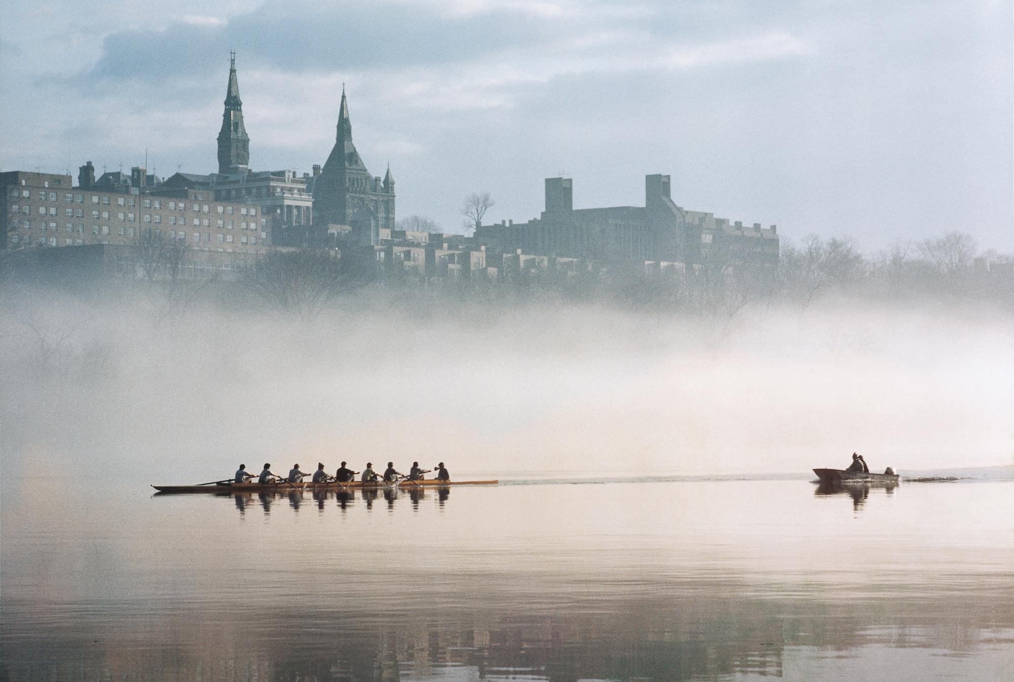 Rowers Gliding Past Georgetown University on the Potomac in the Dim Light of Dawn