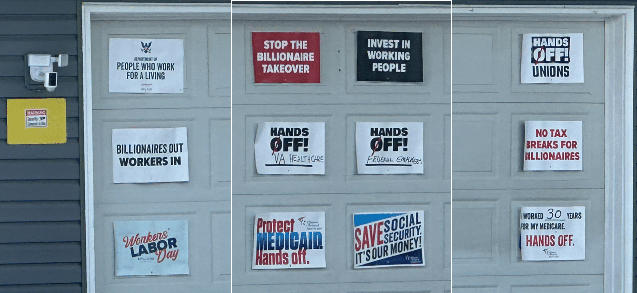 Crime Watch Minneapolis obtained photos from a resident of Edwards’ West St. Paul neighborhood that show Edwards’ garage is covered with printed signs with sayings like, “Stop the billionaire takeover,” “Hands off unions,” “Hands off federal employees,” and “Protect Medicaid.” Other signs reference protecting VA healthcare and social security.